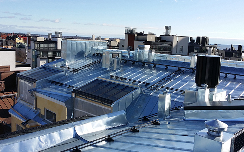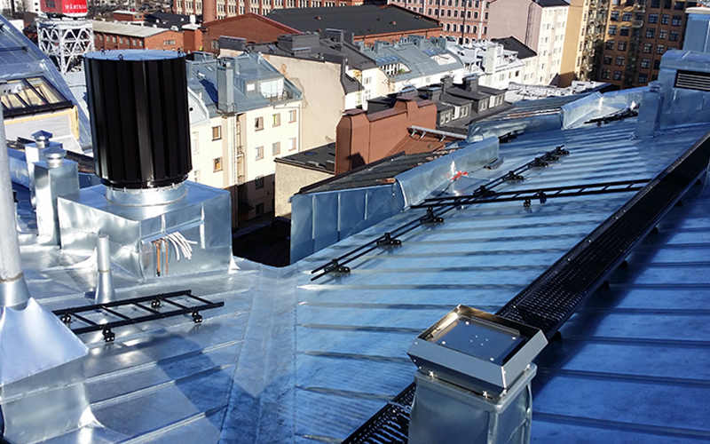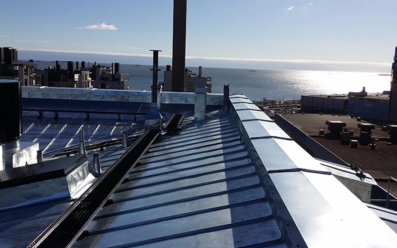Työ: Uusi rivisaumapeltikatto 1400 m2 kattoturvatuotteineen ja ullakkohuoneistojen kantavat teräsrakenteet.